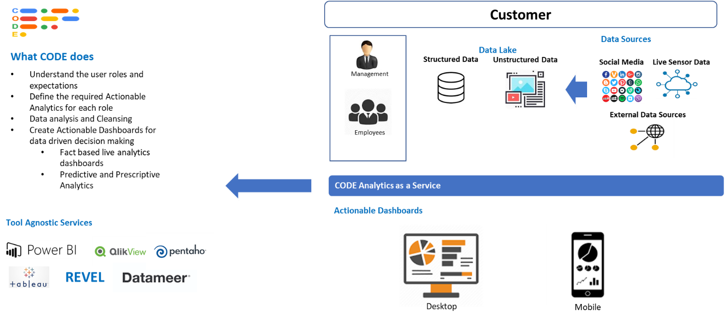 CODE helps clients to convert structured and unstructured data into actionable insights to make your business decisions data driven. Through years of working with fortune 1000 companies our teams can easily related to our client requirements to design analytics helping our clients to be data driven.